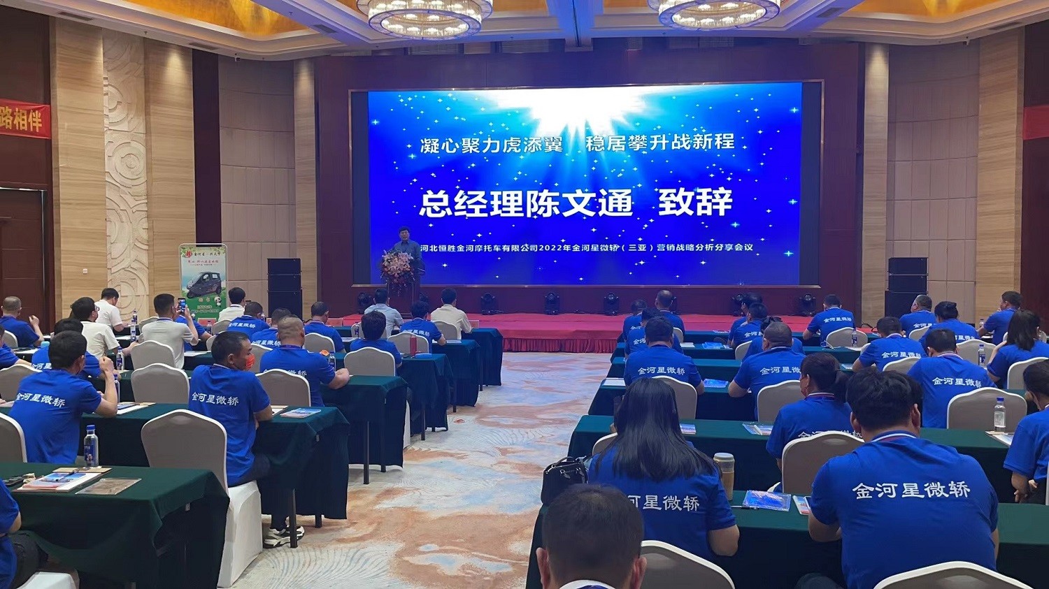 號角已吹響,揚鞭在腳下,河北恒勝金河摩托車有限公司2022年金河星微轎(三亞)營銷戰(zhàn)略分析分享會議在三亞陽光大酒店隆重召開。從金河戰(zhàn)隊“金河發(fā)展,我的責任"洪亮的口號開啟會議模式。