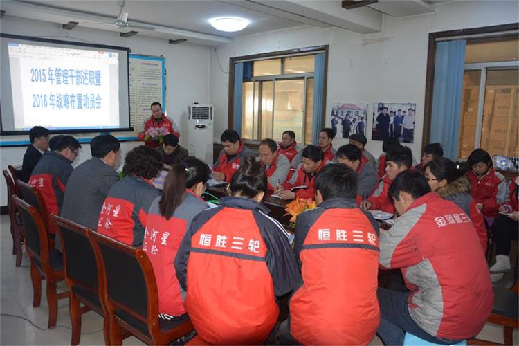 2015年管理干部工作總結述職暨2016年戰(zhàn)略布置動員會昨天下午在金河公司二樓會議室隆重召開,公司高管,中干,骨干,優(yōu)秀員工,班組長參加會議。各部中干做述職報告,總結2015年的得與失,布置2016年工作計劃并展望未來。公司要求2016年繼續(xù)秉承三個打造與一個完善精神,加大力度強品質,推新品,控開支;圍繞“新征程,新使命,新突破”爭創(chuàng)銷售高峰,打造金河戰(zhàn)隊!